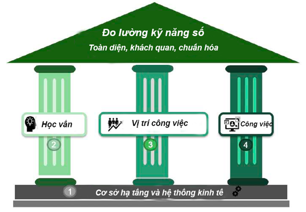Khung năng lực kỹ năng số bao gồm ba thành phần là trụ cột (năng lực), các yếu tố và chỉ số. Có bốn trụ cột chính trong khung năng lực, đó là: 1) Cơ sở hạ tầng và hệ sinh thái; 2) Trình độ học vấn; 3) Vi trí công việc; và 4) các công việc. Những trụ cột này cùng nhau cho phép đo lường các kỹ năng kỹ thuật số theo cách toàn diện, khách quan và chuẩn hóa hơn.
