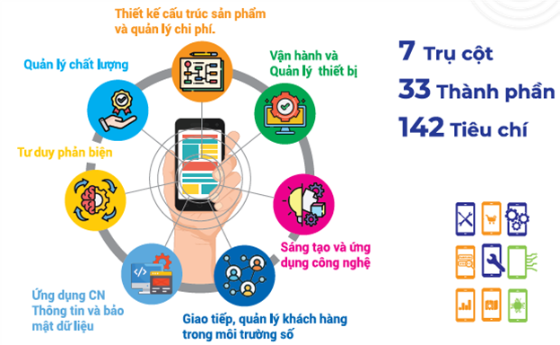 Mỗi ngành nghề có mức độ số hóa khác nhau và mỗi vị trí công việc cụ thể lại có những yêu cầu về năng lực số khác nhau. Trong ngành In cũng vậy, có nhiều công việc chuyên môn đòi hỏi năng lực số khác nhau. Khung năng lực dự kiến được mô tả dưới đây là những đề xuất khung năng lực số cho ngành In. Bao gồm có 7 nhóm năng lực (trụ cột): Vận hành và quản lý thiết bị, Thiết kế cấu trúc sản phẩm và quản lý chi phí, Sáng tạo và ứng dụng công nghệ, Giao tiếp, quản lý khách hàng trong môi trường số, Ứng dụng CNTT và bảo mật dữ liệu, Tư duy phản biện. Trong 7 nhóm năng lực này, có các thành phần (chỉ số) khác nhau, dự kiến có tổng cộng 33 thành phần, để đáp ứng cho các mức năng lực khác nhau, toàn bộ khung năng lực số có 142 tiêu chí, đáp ứng cho 13 khối công việc của ngành.